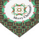 This Christmas table runner is decorated with a pattern of interlocking ribbon like shapes inspired by Celtic knot artwork along with wreaths of holly leaves and berries all in a traditional holiday colour scheme of red and green with golden yellow accents.