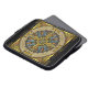An elaborate compass made of Celtic knotwork, printed in silver and copper metallic colour accents on the face and corners as well. Degrees are marked off from 10-90 in each quadrant. Around the compass, all four cardinal points are labelled in engraved-looking Irish-Gaelic on brass colour plates, subpoints are labelled in Irish-Gaelic, and twelve elemental points as well: earth, storm, lightning, metal, air, sun, wind, wood, water, fire, spirit, stone. Also, subtle, decorative rune work decorates an inner ring.