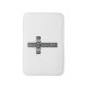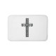 A Celtic Cross bath mat made up of a black cross and white ring, both in Celtic knot designs.