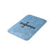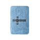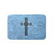 A Celtic Cross bath mat made up of a black cross and white ring, both in Celtic knot designs, against a textured light blue background.