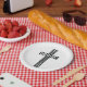 A set of white paper plates with a Celtic Cross made up of a black cross and white ring, both in Celtic knot designs.