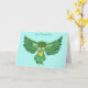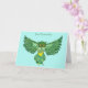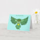 Green Celtic knot work owl with an open wing span in a backdrop of teal.