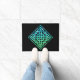 A beautiful welcoming door mat with a blue-green bordered Celtic knot design against a black background.