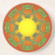 A green-blue Celtic knot set against a sunburst background cork coaster.