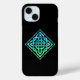 An iPhone 15 Case of a blue-green Celtic knot diamond design against a black background.