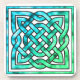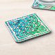 A set of white hard plastic coasters with a blue-green Celtic knot border design.