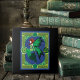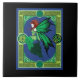 A red haired fairy all in green with green Celtic knot work backdrop.