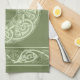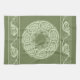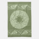 Border of Celtic knotwork intertwined swimming fish design in shades of green, with a large circular swimming fish design medallion in the centre