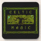 Surrounded by a border of celtic knots, a stylised, mystical forest and riders in tones of green.