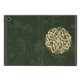 A traditional ancient Celtic ornament, showing four dragon- or snakelike creatures entwined in Celtic knots to form an intricate circle. The ornament is textured in greens and tans on a background of dark green with decorative texture.