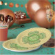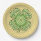 This classic four leaf clover overlays a concentric circle design featuring layers of Celtic weaves in multiple shades of green with a bit of orange for accent.