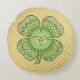 This classic four leaf clover overlays a concentric circle design featuring layers of Celtic weaves in multiple shades of green with a bit of orange for accent.