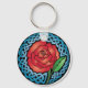 A red rose surrounded by blue Celtic Knotwork, in a stained glass style.