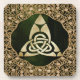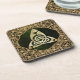 Celtic Trinity knot framed with floral filigree on a dark forest background.