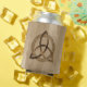 A cool can cooler featuring a simple coloured Celtic triquetra interlaced with a circle forming a trinitarian symbol against a wood background, representing spiritual unity with the divine.
