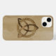 An iPhone 14 Case featuring a simple colored Celtic triquetra interlaced with a circle forming a trinitarian symbol against a wood background, representing spiritual unity with the divine.