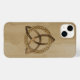 An iPhone 14 Plus Case featuring a simple coloured Celtic triquetra interlaced with a circle forming a trinitarian symbol against a wood background, representing spiritual unity with the divine.