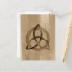 Simple coloured Celtic triquetra interlaced with a circle forming a trinitarian symbol craved against a wood background, representing spiritual unity with the divine.