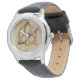 A stainless steel black Celtic watch design featuring a simple coloured Celtic triquetra interlaced with a circle forming a trinitarian symbol against a wood background, representing spiritual unity with the divine.