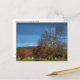 This postcard conveys a sense of peace and serenity. It's a glorious sunny late autumn day in an upstate New York cemetery. The sky is a deep blue with just a few fluffy clouds. A huge old maple tree has dropped its top leaves on the grassy ground. The white and grey gravestones seem to be resting peacefully against a backdrop of red, gold and brown hills.