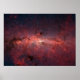 This dazzling infrared image from NASA's Spitzer Space Telescope shows hundreds of thousands of stars crowded into the swirling core of our spiral Milky Way galaxy. In visible-light pictures, this region cannot be seen at all because dust lying between Earth and the galactic centre blocks our view. In this false-colour picture, old and cool stars are blue, while dust features lit up by blazing hot, massive stars are shown in a reddish hue. Both bright and dark filamentary clouds can be seen, many of which harbour stellar nurseries. The plane of the Milky Way's flat disc is apparent as the main, horizontal band of clouds. The brightest white spot in the middle is the very centre of the galaxy, which also marks the site of a supermassive black hole. The region pictured here is immense, with a horizontal span of 890 light-years and a vertical span of 640 light-years. Earth is located 26,000 light-years away, out in one of the Milky Way's spiral arms. Though most of the objects seen in this image are located at the galactic centre, the features above and below the galactic plane tend to lie closer to Earth. Scientists are intrigued by the giant lobes of dust extending away from the plane of the galaxy. They believe the lobes may have been formed by winds from massive stars. This image is a mosaic of thousands of short exposures taken by Spitzer's Infrared Array Camera (IRAC), showing emissions from wavelengths of 3.6 microns (blue), 4.5 microns (green), 5.8 microns (orange), and 8.0 microns (red). The entire region was imaged in less than 16 hours.