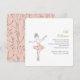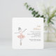 Adorable ballet themed little girls party invitation featuring a sweet illustration of a ballerina in a tutu dancing on stage in a light pink, silver and gold colour palette.