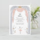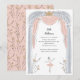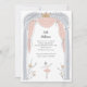 Adorable ballet themed little girls party invitation featuring a sweet illustration of a ballerina in a tutu dancing on stage in a light pink, silver and gold colour palette.