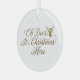 "Oh Deer, It's Christmas Here" Ceramic Circle Holiday Ornament . This delightful ornament features the punny phrase "Oh Deer, It's Christmas Here" rendered in a beautiful, flowing gold script. Integrated into the design is a charming silhouette of a deer head wearing a festive Santa hat, adding a playful touch to the elegant typography.