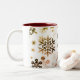 Holiday winter ceramic coffee mug shown with a festive multi colour Maroon & Gold tone snowflakes print. Maroon interior.