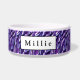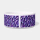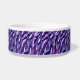 This ceramic pet bowl is shown in a multi colourful purple abstract pattern.