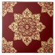 This sunny yellow and maroon tile is just the thing for your kitchen backsplash, bathroom, or even fireplace. The design is an intricate medallion. It has 1/4 of the medallion in each corner which makes it perfect for an all-over installation The background is dark maroon. The design has knock-out sections (like lace) so that the background colour shows through from Oregon Tile maker Fay Jones Day.
