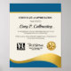 Universal certificate of excellence or appreciation featuring modern wavy design in blue and gold colour scheme, faux gold seal or emblem; just add your text, logo, and upload a signature or delete and write in later.