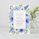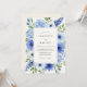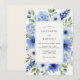This design features a lush arrangement of watercolor florals in varying shades of sky and cerulean blue. Delicate hydrangeas, anemones with dark centers, and tall lupine-like blooms are paired with soft sage green leaves. The overall aesthetic is fresh and airy, making it ideal for a bright seasonal outdoor event.