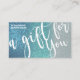 This is the perfect gift certificate business card for a trendy, stylish, girly, and modern businesswoman. This design features a simple white handwritten brush script typography on a faux printed cerulean blue into teal green into pale turquoise sparkly glitter ombre gradient glamourous and chic background. It's the perfect way to allow your customers to buy a gift for their family and friends and at the same time promote your business.