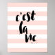 French expression that means "it is the life." Can also be translated into English as: - "that's life". A fun print for home, office, dorm, anywhere. Bold black brush-lettered look on a white and pink stripe background.