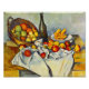 Cezanne The Basket of Apples print. Oil painting on canvas from 1894. Paul Cezanne was a master still life painter and The Basket of Apples is his most famous work. The painting features a wine bottle, plate of bread, and whicker basket full of red, green and yellow apples on a white table cloth. A great gift for fans of Cezanne, post-impressionism, and kitchen prints.
