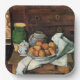 Paul Cezanne painting: Vessels, Fruit and Cloth in front of Chest, square tile.