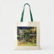 An impressionistic image of a chair with a hat and a bird fountain in a wildflower garden.