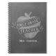A spiral notebook featuring a chalk inspired illustration of an apple covered with a banner that says "FIRST GRADE TEACHER" over a chalkboard inspired background. Personalise with your name.