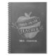 A spiral notebook featuring a chalk inspired illustration of an apple covered with a banner that says "THIRD GRADE TEACHER" over a chalkboard inspired background. Personalise with your name.
