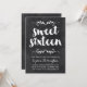This rustic, country-chic invitation for a sweet sixteen birthday party features a pretty brush script calligraphy that reads "Sweet sixteen" and looks like it's written in chalk. The design also includes floral flourishes and a chalkboard background.