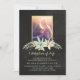 Invitation for a memorial service with a chalkboard background and a custom photo inside a gold frame, decorated with flowers.