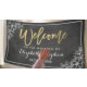 Modern Wedding Welcome Banner Templates - Elegant Gold Script and White Floral Frame on Grunge Black Chalkboard Background.