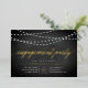 Our rustic elegant engagement party invitations in black and white feature a chalkboard background with strings of white lights across the top, and "engagement party" in chic gold foil calligraphy script typography. Personalise with your engagement celebration details beneath in white.