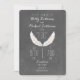 A wedding invitation featuring an illustration of two white feathers accented with peach and blue over a chalkboard inspired background.