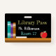 A simple library hall pass with a faux chalkboard , 3 books and a apple . It can easily be personalised with the pass title , the teacher's name and room number (or school name) . Visit our store for hall passes with a different theme .