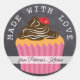 Made With love From The Kitchen Of Stickers-A cute pink cupcake decorates the personalised kitchen baking stickers with a rustic chalkboard background.