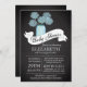 Modern chic Chalkboard Mason Jar Baby Shower invitation featuring a contemporary ribbon banner with a fancy script and colourful fun mum blue flowers for a baby boys shower. A bit of vintage charm with a modern flair boy baby shower invite with typographic text. Perfect wedding shower invitation for a garden baby shower, spring baby shower, or summer baby shower.