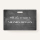 Modern and stylish name tag - My name is. Personalise the tag with your name. The text is in white colour. The background is a trendy grey chalkboard. Great for large gatherings and hospitality events.