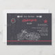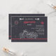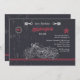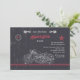 A chalkboard, man's invitation with red accents. It features the word "Motorcycle", "No1", and a red star, along with a motorcycle drawling and zipper pulls to frame the name. (FP)
